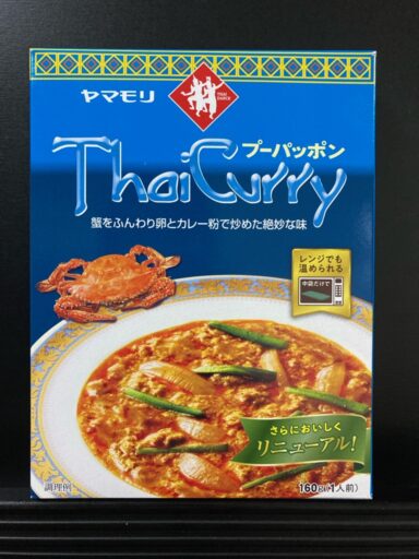 タイ プーパッポンカリー レトルト・カレーの旅 2025.11.26 タイの海鮮レストランで有名なカレー。「プー」はタイ語で蟹、「パッ」は炒める、「ポンカリー」はカレー粉の意味。卵のふんわりとした食感に蟹のうま味が加わって、スパイスの風味も感じられるタイカレー。成城石井で買ったが、暑い日に食べると、少しだけタイ気分。 発売元は、様々なタイカレーのレトルト商品をリリースしているヤマモリ。